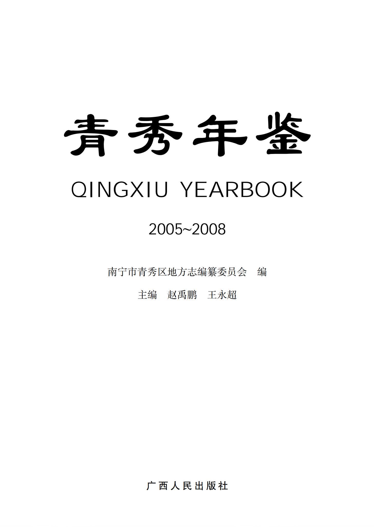 二、《青秀年鉴》于 2010 年创刊,本年鉴为总第一卷,着重记载 2005~2008 年度青秀区的基本情况。以后每年出版一卷。